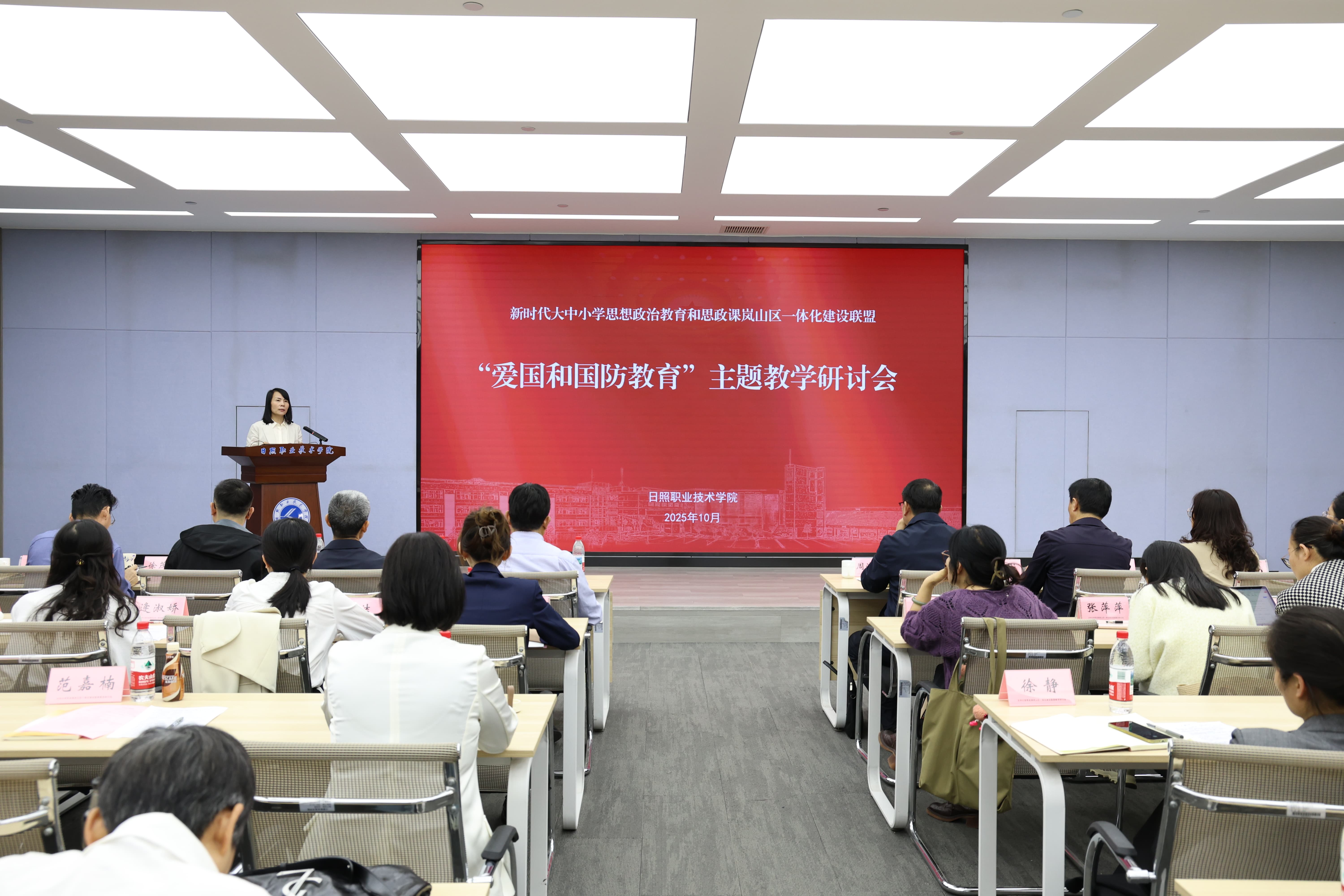 10月14日下午,新时代大中小学思想政治教育和思政课岚山区一体化建设联盟“爱国与国防教育”主题教学研讨会在日照职业技术学院天润楼1楼会议室举行,岚山区教育与体育局有关负责同志、学校思政部班子成员出席会议,岚山区大中小学各学段思政课教师代表、思政教育工作人员代表及学校思政部全体教师参加会议。