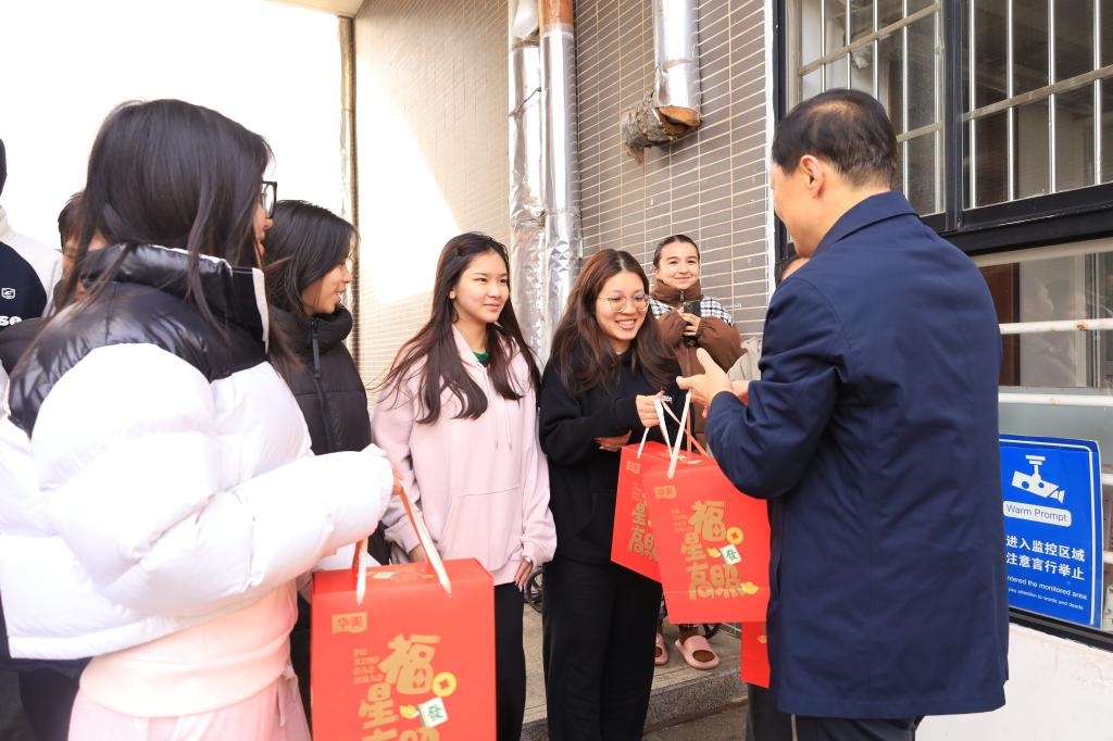 苏海勇一行先后来到学校值班室、监控室、门卫、物业、留学生公寓,与坚守在岗位上的干部职工、安保人员、后勤保障人员亲切交谈,与在校留学生共同贴春联,认真聆听值班值守期间的工作难点与需求,详细了解应急值班安排、工作情况及生活保障,对大家舍小家为大家,坚守校园一线、守护校园平安的奉献精神给予充分肯定和衷心感谢。同时,向全体值班值守人员及其家属致以诚挚的节日问候和新春祝福,并勉励大家要切实做好春节期间的安全隐患排查、应急处置及各项服务保障工作,筑牢学校安全防线。