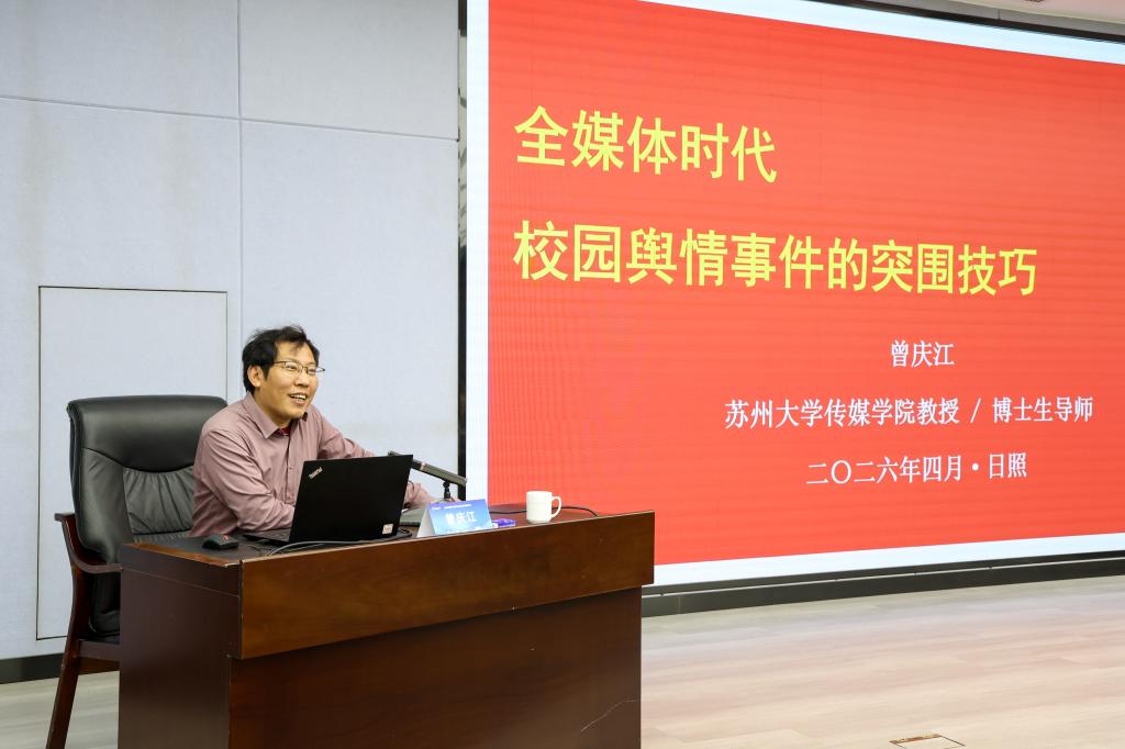 在专题授课环节,苏州大学传媒学院教授、博士生导师曾庆江围绕《全媒体时代校园舆情的防范与应对》,从传播规律出发,深入剖析了校园舆情的生成机制与科学应对路径。山东广播电视台《山东新闻联播》编辑部主任陈龙则以《主题宣传如何做到“短实新”》为题,从媒体实操角度,为职业院校宣传工作者提供了切实可行的方法论指导。山东师范大学期刊社社长、编审王晓华以《新时代高校新闻生态与实践探索》为题,分享了新时代高校新闻宣传工作的转型方向与实践经验。常州机电职业技术学院党委委员、宣传部长毛加明教授以《高校舆情易发点及应对》为题,结合典型案例,系统梳理了高校舆情的风险来源与处置策略。陕西铁路工程职业技术学院工程管理与物流学院党总支书记、党委宣传部副部长张玉鹏结合自身丰富经验,作了题为《挖掘校园新闻故事,提升学校宣传工作水平——全媒体时代职业院校做好宣传工作的思考》的专题报告。