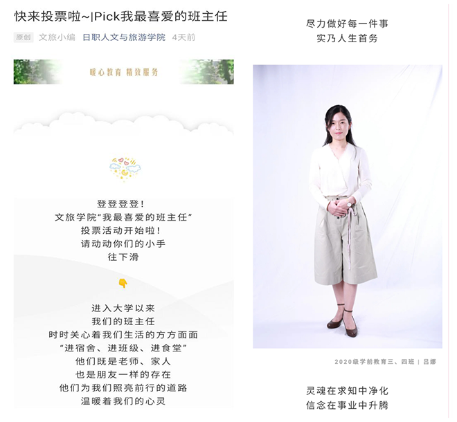 活动前期,通过学院微信公众号展示各位班主任风采,由学生进行投票,投票活动发起后,各班同学便踊跃参与,纷纷动起手指为自己最喜爱的班主任投票,表达自己对老师的喜爱之情。经过两天投票,票数最高的是2018级学前教育六、七、八班班主任张伟、2019级学前教育三班班主任张金芝和2020级学前教育三、四班班主任吕娜三位老师。