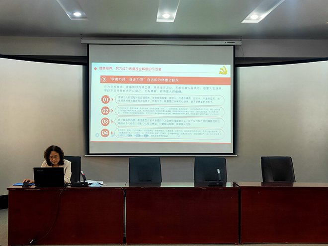 李侠以当前教师队伍中存在的问题为切入点,从“坚定理想信念,把牢思想和行动的“总开关””“提高修养,努力成为传道授业解惑的示范者”“勇于担当,成为实现中国梦的助力者”“习近平总书记眼中的“人民教师””等四个方面,进行讲述。她指出,理想信念是共产党人精神上的“钙”,只有坚定理想信念,才能在政治上经得起风浪考验,关键时刻信得过、靠得住、顶得上;作为党员教师,要常修为师之德,常怀律己之心,不断完善人品操行,提高人生境界;教师要敢于担当、勇于负责、努力成为真抓实干的行动者,做有理想信念、有道德情操、有扎实学识、有仁爱之心的“四有”教师;要认真学习、深刻领会习近平新时代中国特色社会主义思想并用来武装头脑、指导实践、推动工作,努力做到政治立场坚定、学术造诣深厚、作风品行端正,切实践行好为党举旗、为党育人、为党立言的崇高使命。