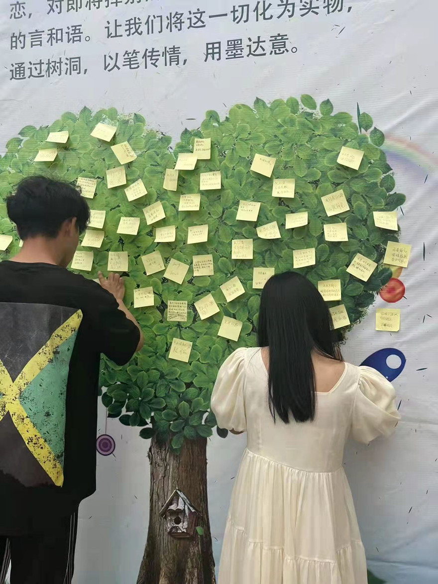 本次活动将留言板设置在地滋楼二楼报告厅门前,以“心理树洞”的形式展开,活动一经推出,前来参加的学生络绎不绝,纷纷在便签纸上亲手书写自己真挚的情感。有的同学回忆起第一次来到大学时的激动紧张,第一次走进课堂的满心期待;有的同学感念母校的一草一木、一花一树;有的同学感慨自己退去稚气变得成熟,庆幸收获三年珍贵的同窗友谊。老师们和学弟学妹们也参与进来,用一张张满怀祝福的便签纸,寄托着对于毕业学子的不舍,流露着对于未来的期盼。