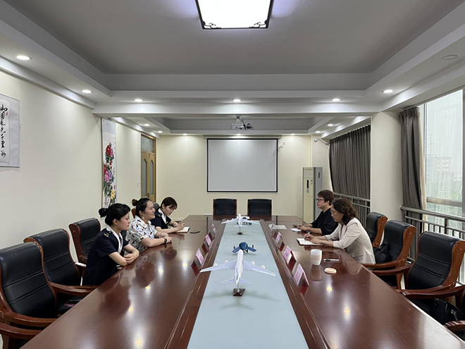 座谈时,陈鹃介绍了华鲁航空学校的发展历程、师资现状及学生情况,该校空中乘务专业每年招生400人,生源充足,希望能与我校建立密切的合作关系,为空中乘务专业输送优质生源。李侠首先对华鲁航空学校给予我校的信任表示感谢,接着介绍了我校空中乘务专业的培养特色以及学生就业情况。随后,双方就如何开展合作、学生学历提升等问题进行了深入探讨。