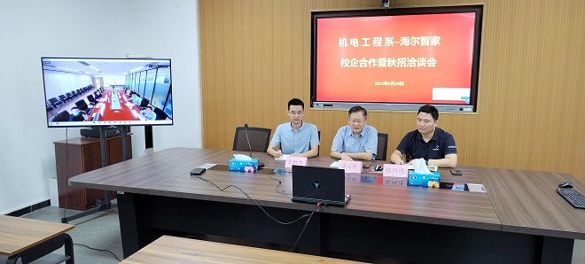 为拓展优质企业校企合作空间,拓宽学生就业渠道,提升就业质量为,9月28日,机电工程系在山润楼423会议室与海尔智家开展校企合作暨秋招线上交流会,会议由机电工程系团总支书记张西进主持,海尔智家智慧园区安全部部长侯君,智慧园区行政部部长徐朝阳,智慧园区人力部部长张焕亮、经理孙畅,机电工程系党总支副书记成元学、就业辅导员辛世杰参加会议。