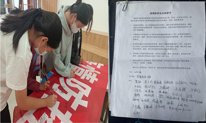 各班利用晚自习时间,开展了疫情防控安全教育活动,确保全体学生清楚认识疫情防控的重要性,明确防控要求。以班级为单位发放承诺书60份,学生集体学习了承诺书内容并签名。在现场签名活动中,同学们积极参与,在横幅上郑重签字,承诺遵守学校疫情防控措施,履行好防控疫情责任,坚定信心、共战疫情。一个个名字签在横幅上,疫情防控责任也烙在了同学们的心上,坚定了学生为疫情防控贡献力量的信心和决心。