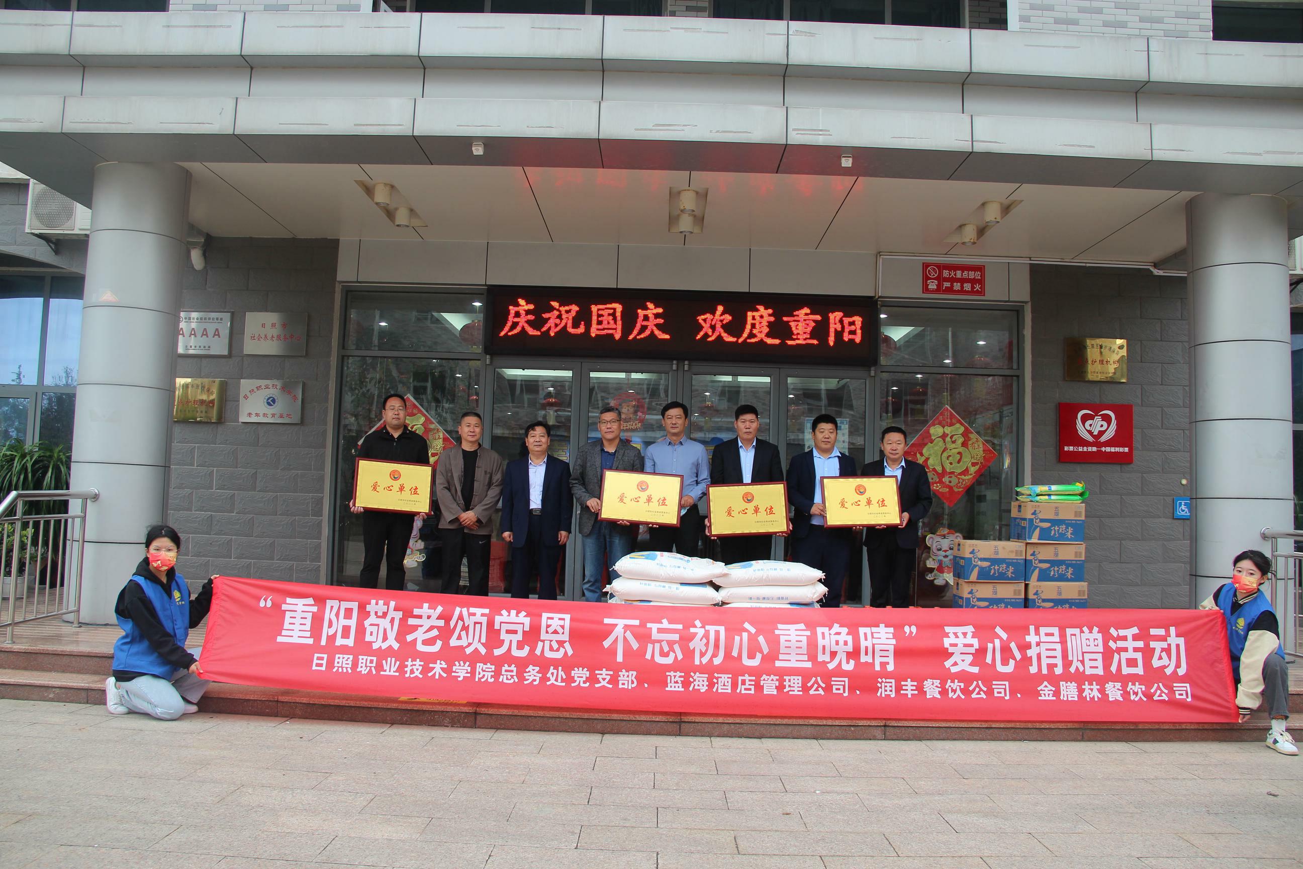 金秋送爽,岁岁重阳。为弘扬中华民族“尊老、敬老、爱老、助老”的传统美德,10月4日上午,总务处党支部会同餐饮公司骨干携带米、面、油等生活物品到日照市养老服务中心,开展“重阳敬老颂党恩 不忘初心重晚晴”爱心捐赠活动,为老人们送去节日祝福。