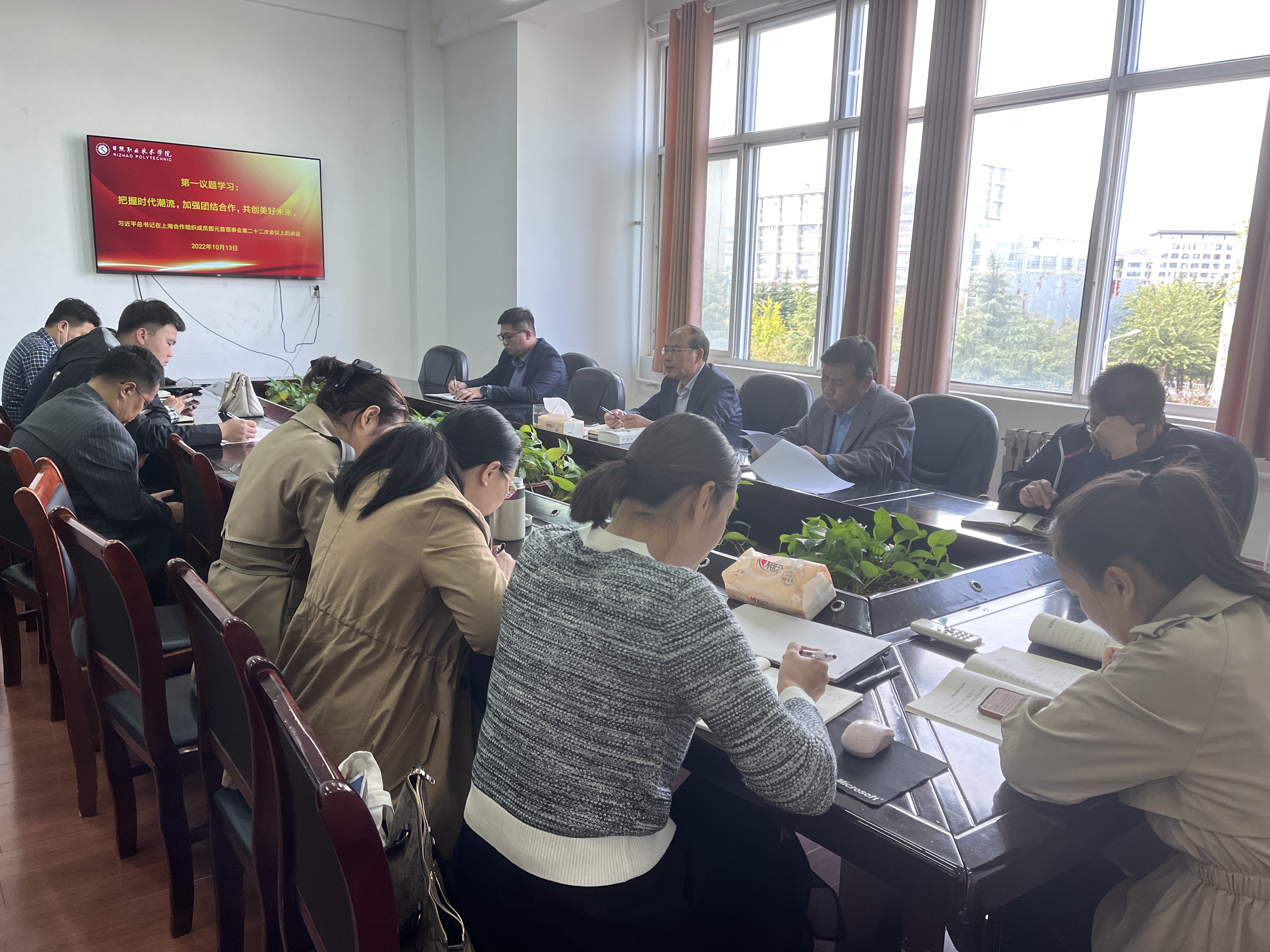 首先进行第一议题学习,商学系党总支副书记李运昌带领大家学习习近平总书记在上海合作组织成员国元首理事会第二十二次会议上的重要讲话精神。