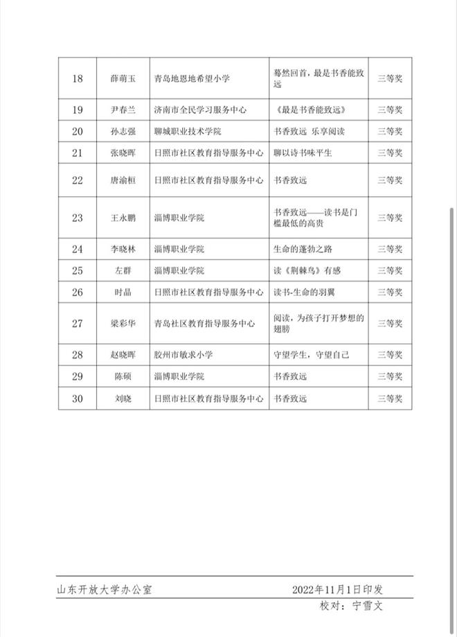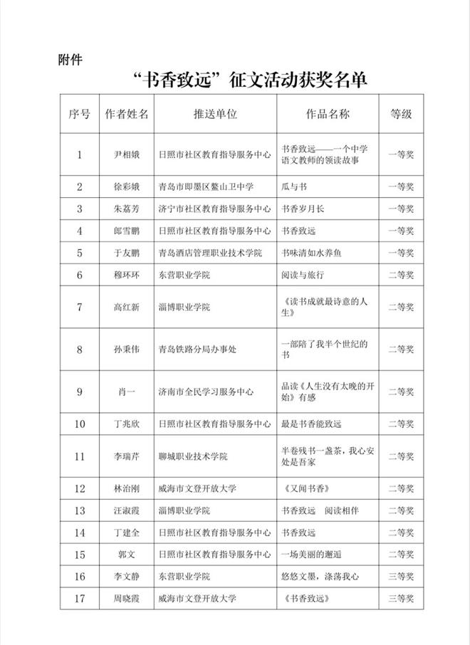 近日,由山东省社区教育指导服务中心组织开展的第二届“书香齐鲁”全民阅读暨“书香致远”征文比赛发布评选结果,由日照市社区教育指导服务中心推荐的作品荣获一等奖2名,二等奖3名,三等奖4名,获奖名次和数量均列全省第一。