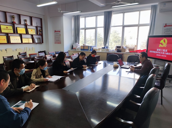 激流勇进担使命,勇毅前行谱新篇,11月17日下午,建筑工程系道桥测量教师党支部在海润楼党员活动室召开主题党日活动,传达学习党的二十大精神,安排部署党的二十大精神宣传工作。道桥测量教师党支部全体党员教师参加会议。