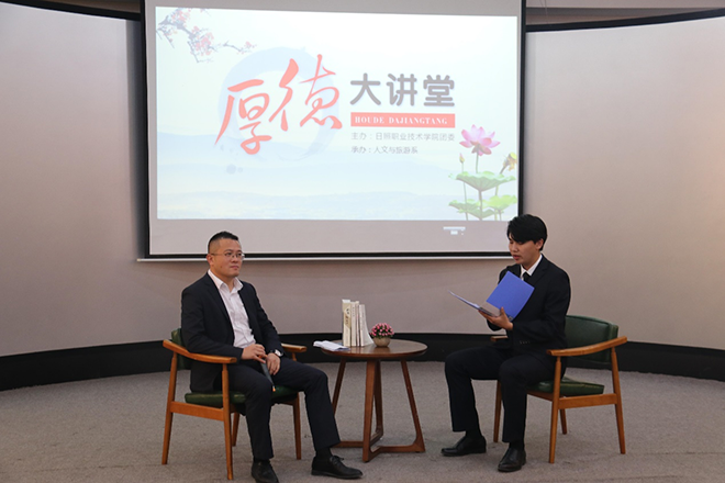 11月16日下午,由团委主办、人文与旅游系承办的厚德大讲堂活动在和润楼一楼报告厅举行。2022年日照市岚山工匠获得者、新东港控股有限公司酒店板块运营总监、人文与旅游系优秀校友李春峰受邀做访谈嘉宾,系学工科科长张伟、酒店管理专业教师代表、辅导员代表和2022级学生代表参加活动。
