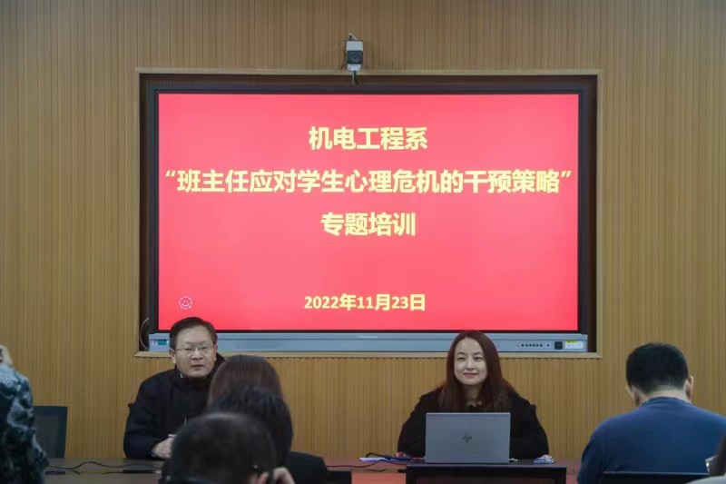 为提高班主任对学生的心理危机的捕捉、应对能力,有效开展学生心理健康辅导,提高心理辅导的科学性、实效性,预防学生因心理问题引起的系列问题,提高学生心理的干预工作。11月23日,机电工程系邀请心理辅导中心周末老师举行了“班主任应对学生心理危机的干预策略”专题培训会。