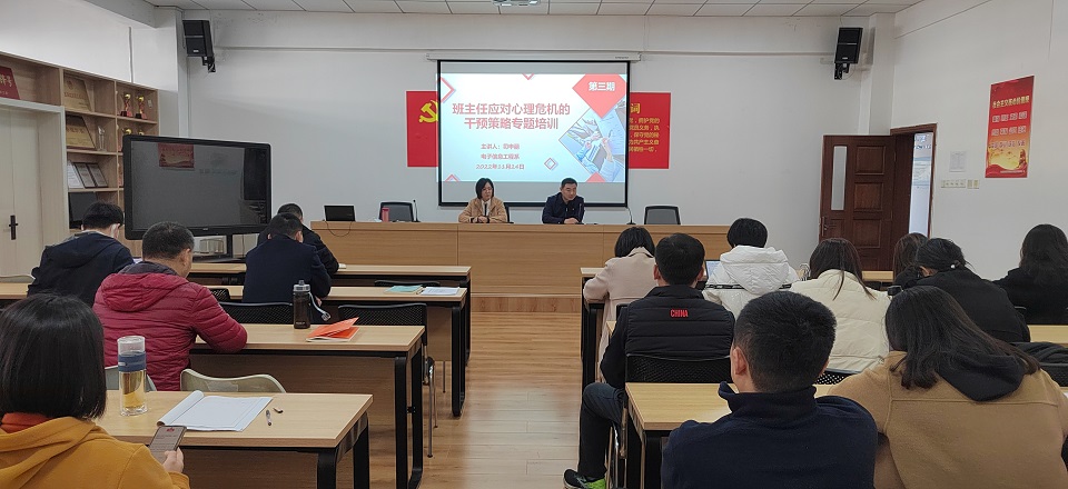 为进一步提升我系班主任队伍处理突发事件的能力,做好学生心理健康教育工作,维护校园稳定,11月24日,电子信息工程系组织召开“班主任应对学生心理危机干预策略”专题培训,大学生心理健康中心教师司申丽主讲,全体辅导员、班主任参加培训。培训由党总支副书记田锋主持。