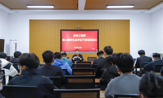 为学习宣传贯彻党的二十大精神,用习近平新时代中国特色社会主义思想武装广大学生干部,推动学生干部队伍建设,11月25日下午,机电工程系在山润楼423举办了2022年下半年“青马工程”暨学生干部培训会,我系新一届学生会干部参加,学生科(团总支)张西进主持并进行培训。