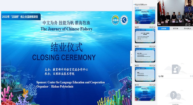 12月12日,我校承办的教育部2022年“汉语桥”“中文为舟,技能为帆,耕海牧渔”线上团组项目,在和润楼B115会议室举行结业仪式。海洋技术系负责人黄贤刚、国际教育系副主任张子龙以及项目部分授课教师代表、参训学员参加了结业仪式。结业仪式由张子龙主持。