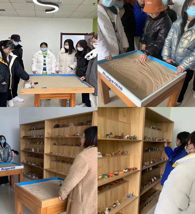 首先,司申丽向大家介绍沙盘团辅的相关理论知识,她强调沙盘团辅整合了荣格分析心理学理论和东方哲学文化的精髓,通过创造的意象和场景来表达自己。随后在司申丽的引领下,大家开始分组感受沙盘、绘制沙盘。在四轮的沙盘绘制过程中,同学们根据自己的喜好依次选取和摆放沙具,并在每轮绘制完成后分享自己的想法和感受。大家从刚开始的各自为政,到后期的共同绘制,逐渐领会到了团体协作的力量,同时也感受到了沙盘的强大的魅力。