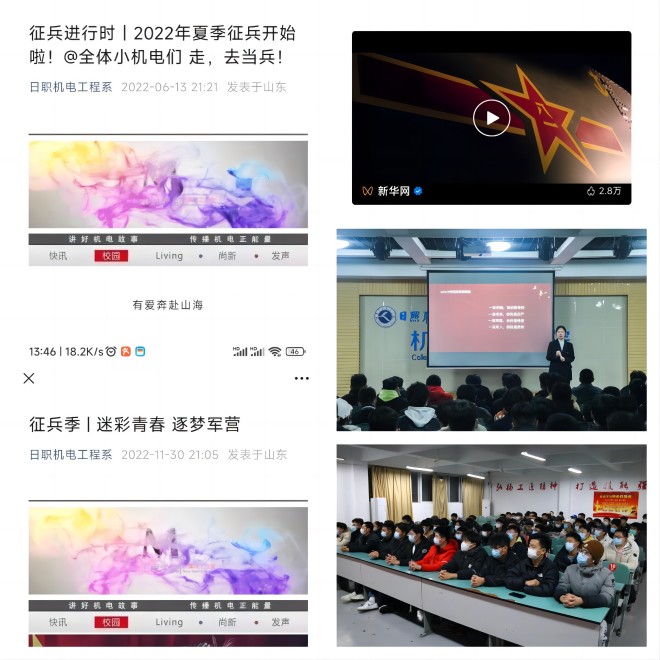 为积极响应党和国家增强国防力量的号召,帮助我系学生进一步了解大学生应征入伍政策,激励青年学子报效祖国、为国防事业贡献力量,机电工程系本年度通过多平台、多渠道于上下半年各开展一次大学生征兵宣传专题活动。