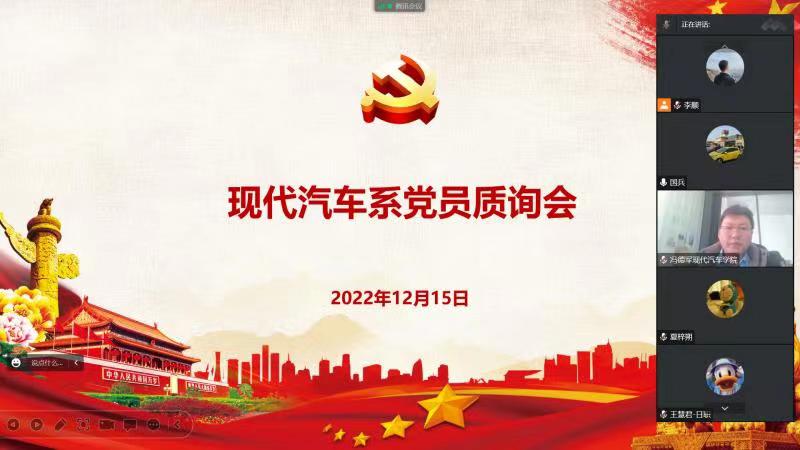 为进一步加强党内监督,发挥党员的主体地位,激发党员工作热情,提高工作水平,12月15日下午,现代汽车系党总支召开2022年度党员质询会,根据疫情防控要求,此次会议采取线上会议形式,会议由党总支副书记庄岩主持,全体教师党员参加。