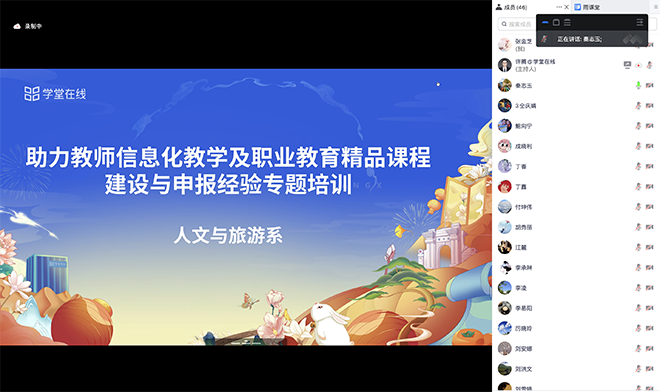 为进一步落实教育部办公厅与山东省教育厅《关于开展2022年职业教育国家在线精品课程遴选工作的通知》,推进教育数字化战略行动,创新线上线下混合式教学,大力提升课程建设质量,2月8日-9日,人文与旅游系联合学堂在线举办了线上“助力教师信息化教学及职业教育精品课程建设与申报经验专题培训”活动。