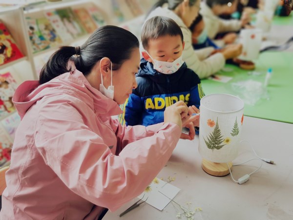 亲子一起做一盏压花艺术台灯,兼具手工体验与艺术创作,解放了大朋友小朋友的身心的同时也发挥了孩子的想象力与创造力,而且在制作过程中体会到了美好的亲子时光。孩子们纯真的心灵捧着点缀斑斓花朵的台灯,仿佛看到了晚上伴着芳香酣然入梦的自己。(图书馆 胡胜男)