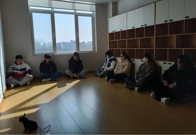 活动第二部分为冥想体验环节。同学们跟随着老师的指导语,将身体调整为舒适放松的状态,缓缓地闭上了双眼,专注于自己的呼吸。“有一束光照向自己,你觉得那是一束什么颜色的光呢?”“请你想象你的内心中有一个小孩,他现在是什么表情呢?”“感受自己的身体,请紧皱眉头,并慢慢放松,感受此刻的放松。”冥想带大家感受身体的各个部位,由紧张再到放松,效果非常显著,内心平静且安定。本次活动的体验者宋凝香说“整体感受就是听了之后内心很舒服很明媚,就像心脏裂开了一道缝射进来一道光”;谢绍毅说“通过冥想,我感觉收获比较大。在老师的指引下,在自己的内心里出现了一个小孩儿,我和那个孩子不断的接触,去感受那个孩子我有了一种前所未有的感觉,仿佛整个身体都轻松了,以后我有机会就会经常冥想,相信我会有很大的提升的”。