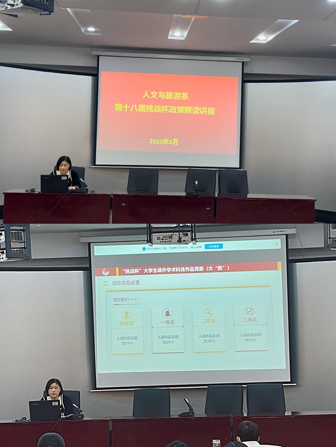 为进一步提升教师指导创新创业大赛能力和学生的科技创新能力,备战新一轮“挑战杯”竞赛,3月21日,人文与旅游系在和润楼一楼报告厅举办“挑战杯”大学生课外学术科技作品竞赛赛事解读专题讲座。讲座由系党总支副书记陈玉香主持,全体教师以及创新创业协会成员参加。