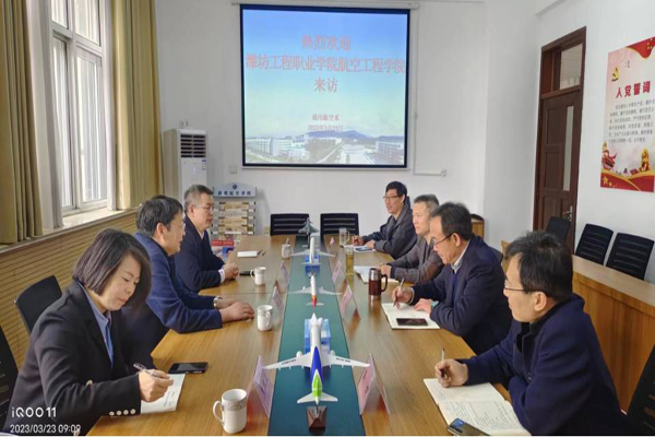 3月23日,潍坊工程职业技术学院航空工程学院院长隋立国、副院长焦红卫来我校交流访问。通用航空系党总支书记牟盛勇在和润楼B205会议室接待了来访客人,党总支副书记费涛、副主任孟凡收等参加交流。