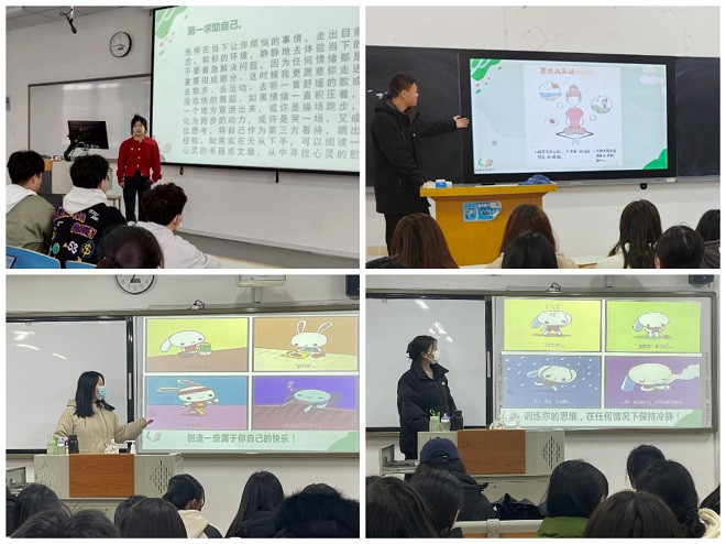 在班会中,各班心理委员向同学们介绍了春季情绪波动的原因及应对方法。针对班级成员的不同情况,各班心理委员向大家介绍了不同的解压方法。通过四格心理漫画,鼓励同学们认识自我、认可自我、肯定自我。最后向班级同学们普及了心理求助的方式,鼓励同学们及时排解自己的情绪,必要时向有关专业人士求助。