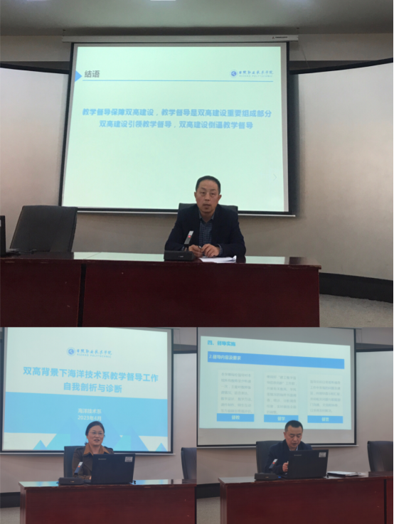 海洋技术系副主任倪雪朋作了题为《双高背景下教学督导工作自我剖析与诊断》的教学督导工作经验交流。倪雪朋主要从双高建设带来的新挑战、海洋技术系教学督导工作情况与诊断剖析、教学督导运行存在的问题、下一步整改方向与对策四个方面进行了汇报。海洋技术系分别成立质量保证工作组、质量保证实施组以及督导组,优化了组织架构。坚持以问题为导向,制定四个问题整改清单,明确责任人和整改时间,开展诊断性听课、结对“一帮一”、反馈“一对一”等整改措施,促进教学质量提升。
