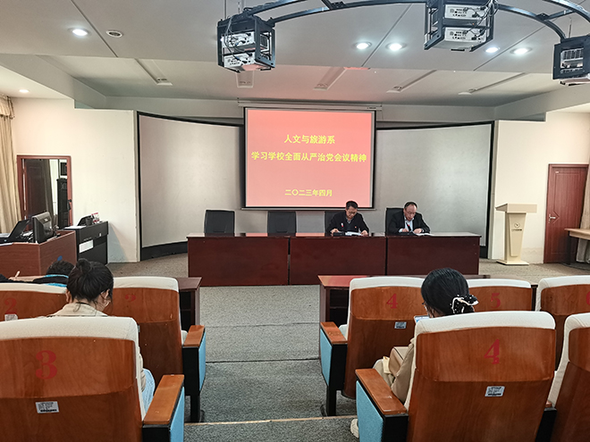 为了进一步压实全面从严治党责任,加强党风廉政建设,4月20日下午,人文与旅游系党总支在和润楼一楼报告厅召开全面从严治党专题会议,传达学习学校2023年全面从严治党工作会议精神。人文与旅游系全体党员教师参加会议。