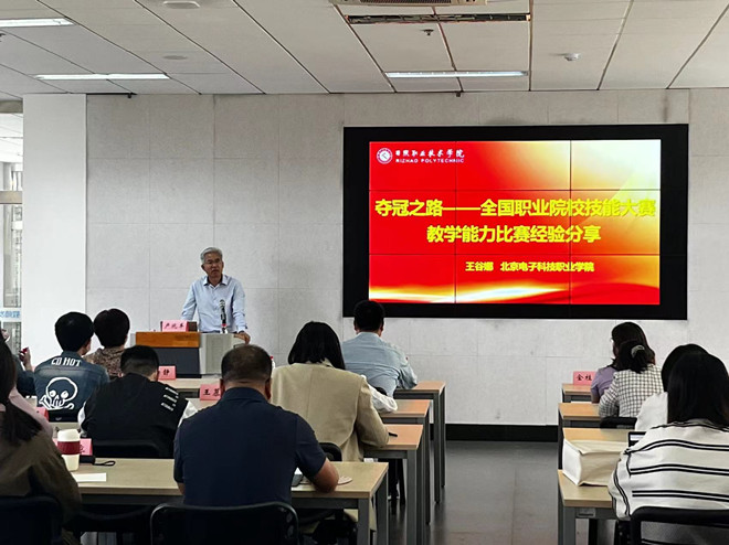 会上,王谷娜结合自身参赛实际,从全国职业院校教学能力比赛概况、赛事理解、作品展示、参赛体会四个方面作了详细讲解。对全国职业院校教学能力比赛的历史演变、赛事指导思想和政策要求、比赛内容、比赛办法和备赛要求等作了详实解读,同时结合自身备赛经验及获奖经历,对参赛团队的组建、参赛内容选择、教案编写要素、实施报告写作、文字材料撰写、视频材料拍摄中可能遇到的问题给予了诚恳的经验分享和相关建议。