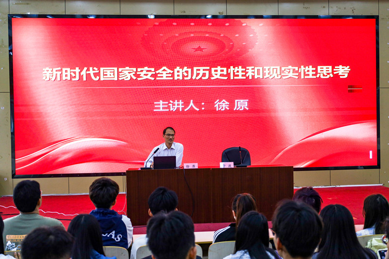 徐原的报告以“新时代国家安全的历史性和现实性思考”为主题。报告引用了党的二十大报告首次设专章对国家安全问题的论述,强调了新时代新征程国家安全工作在党和国家事业全局中的极端重要性,要求师生们要强化理论意识,对总体国家安全观要有更全面的认识。报告围绕“国家安全是民族复兴的根基”、“新时代国家安全工作的历史性成就”、“新时代国家安全工作的根本遵循与行动指南”、“新时代国家安全工作的实践要求”四个方面系统阐述了总体国家安全观产生的历史渊源与现实考量,强调了国家安全与社会稳定对中国式现代化的重大意义,解读了总体国家安全观的丰富内涵,提出了国家安全体系和能力现代化的实践要求。讲座上,他多次强调“事实胜于雄辩,行动高于空谈”,提醒在场师生要擦亮眼睛,提高辨别是非的能力,以坚定的意志品质维护国家主权、安全、发展利益。整场报告深入浅出,启发性强,他与在场师生交流互动,分享日常亲身经历,引发师生共鸣,使师生们更加明确了维护国家安全的重要性,增强了维护国家安全的责任感与使命感。