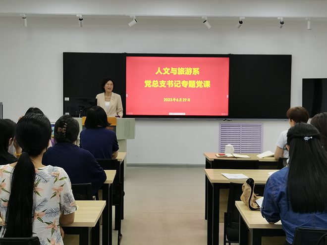 为持续深入学习党的二十大精神,教育和引导广大党员教师坚持用党的创新理论武装头脑、指导实践,为建设教育强国贡献力量,6月29日,人文与旅游系党总支书记李侠讲授“学习宣传贯彻党的二十大精神,加快建设教育强国”专题党课,全体党员教师参加。