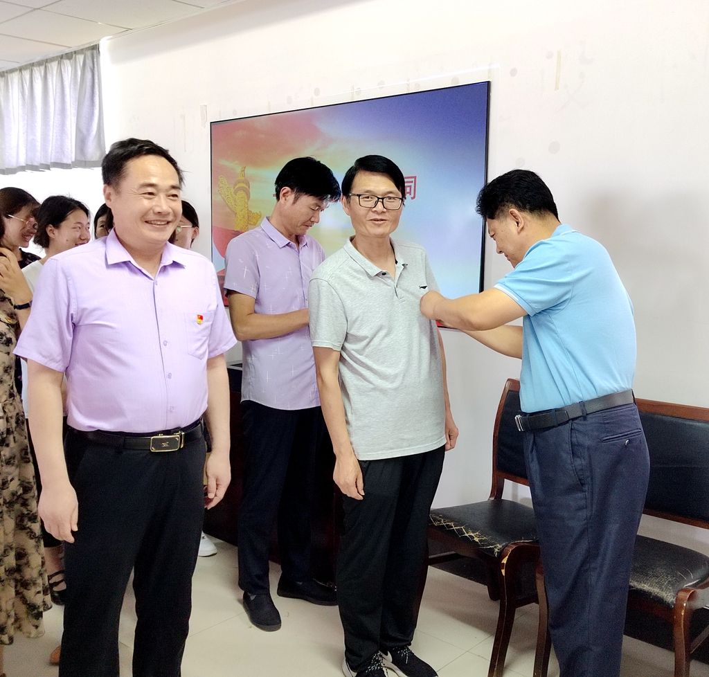 思政部党总支书记刘祥斌同志为党员佩戴党员徽章,鼓励广大教师党员亮身份、树形象、做表率。