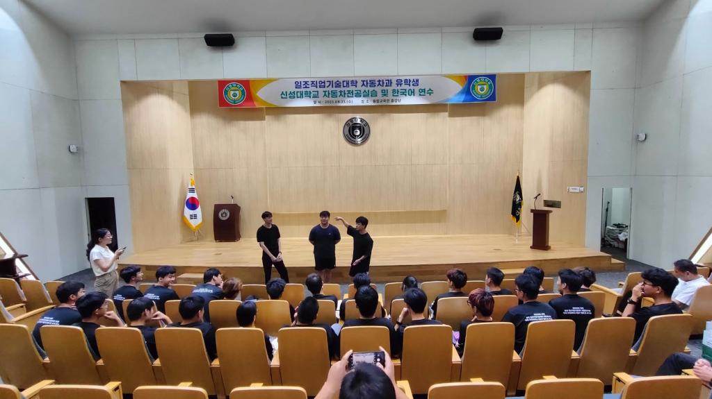 研训期间,新星大学汽车系资深教授罗完龙、高在洙、刘昌倍、文仁贵为学生开展了自动变速器、双离合及无极变速器、汽车电工电子、汽车电气系统故障排除、汽车涂装、发动机零部件测量及性能检测等模块的实训教学,赵顺仁、安耐妍等六位韩语教师分A、B班,为学生开展了韩国语基础教学。同学们在整个研训期间,严守校规校纪和外事纪律,统一组织行动、服从带队教师安排,表现出良好的素养;课堂上学习认真、态度端正,积极参与实训教学活动,专业知识技能取得较大提升;课余积极参加篮球、足球、羽毛球、健身等运动,并与国外学生共同开展了足球友谊赛活动,展现出良好的精神风貌。