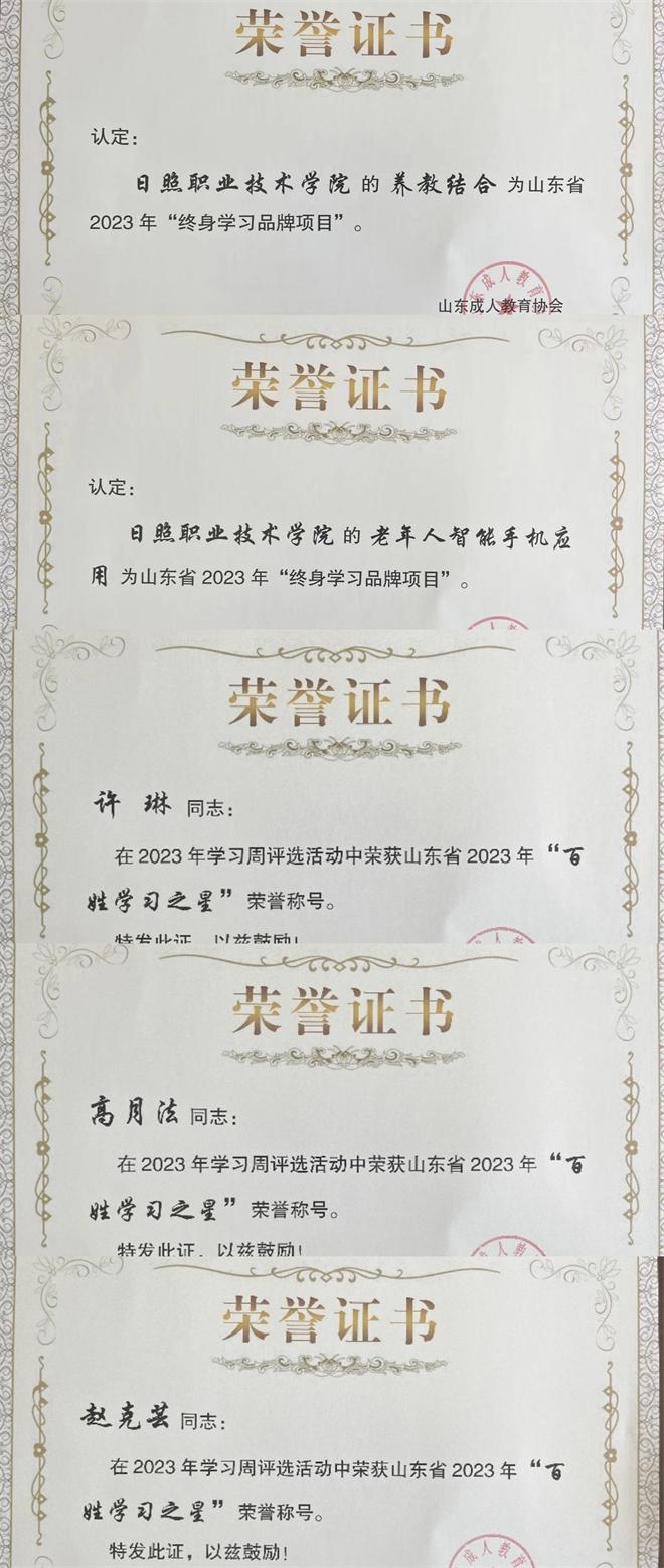 近日,我校社区教育工作又传喜讯,继获得“社区教育大讲堂”终身学习品牌项目之后,又有“老年人智能手机应用”“养教结合”2个项目获2023年山东省“终身学习品牌项目”,赵克芸、许琳、高月法3名同志获“百姓学习之星”荣誉称号。