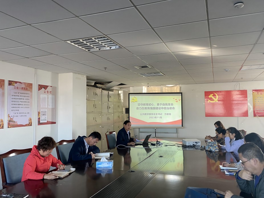 11月7日下午,公共教学部党总支书记万修亮在天润楼501会议室讲“坚守教育初心、勇于自我革命,奋力在教育强国建设中担当使命”专题党课。公共教学部全体党员教师参加。