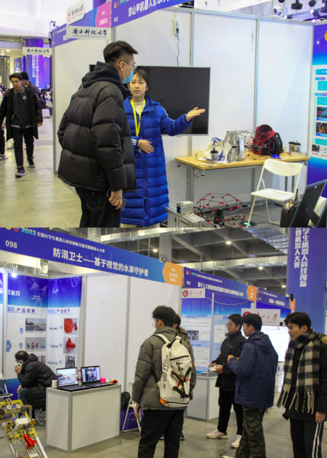在展览现场,同学们以积极学习的态度,向大赛获奖作品的选手进行求教,询问相关技术细节,技术路径,疑点难点。参赛选手认真解答了同学们的问题,也将相关技术细节进行详细介绍,现场学习气氛热烈。