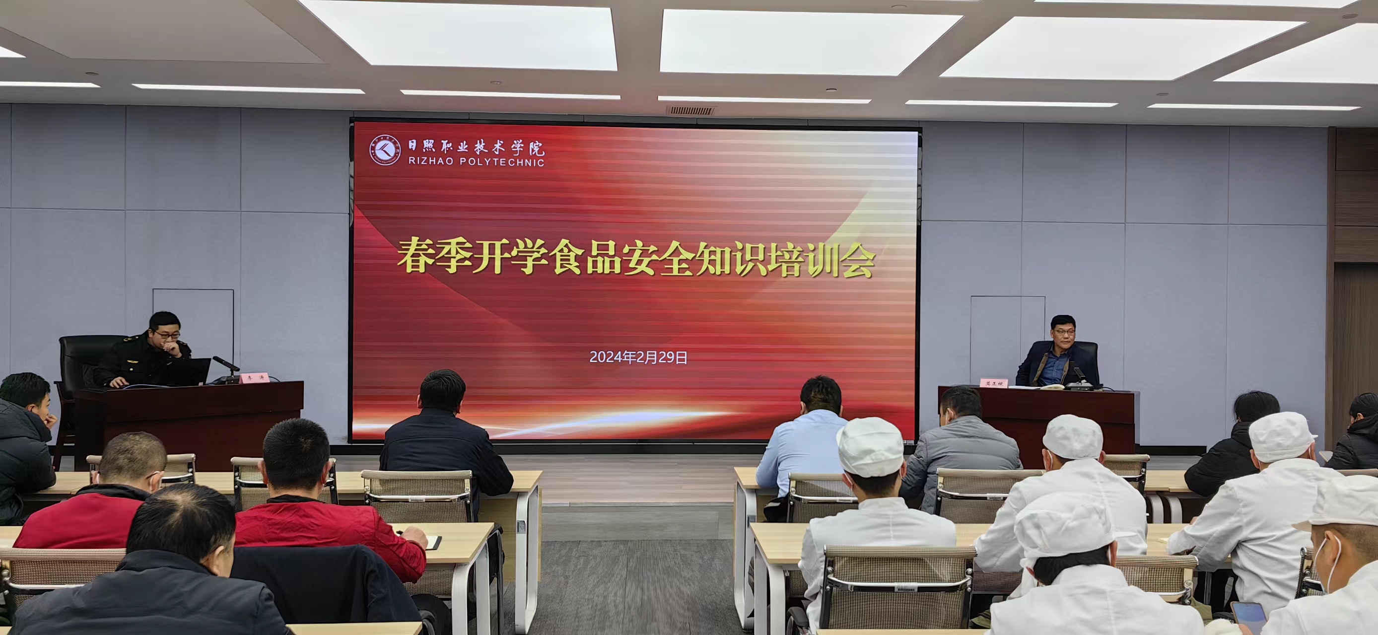 为进一步提升餐厅食品安全管理水平,增强从业人员安全意识,保障师生饮食安全和身体健康,2月29日下午,总务处邀请东港区市场监管局餐饮科科长李涛、东城所所长张琪到校为餐厅从业人员进行食品安全培训。各餐厅食品安全管理员及从业人员100余人参加培训。培训会由总务处副处长莫正根主持。
