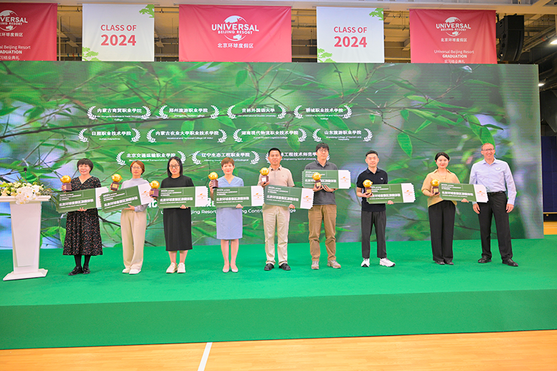 实习结业典礼上,北京环球度假区执行副总裁兼总经理康兆宁授予我校“卓越贡献奖”,6名同学结束岗位实习并顺利转正就业,2名同学获得了“优秀实习生”表彰。
