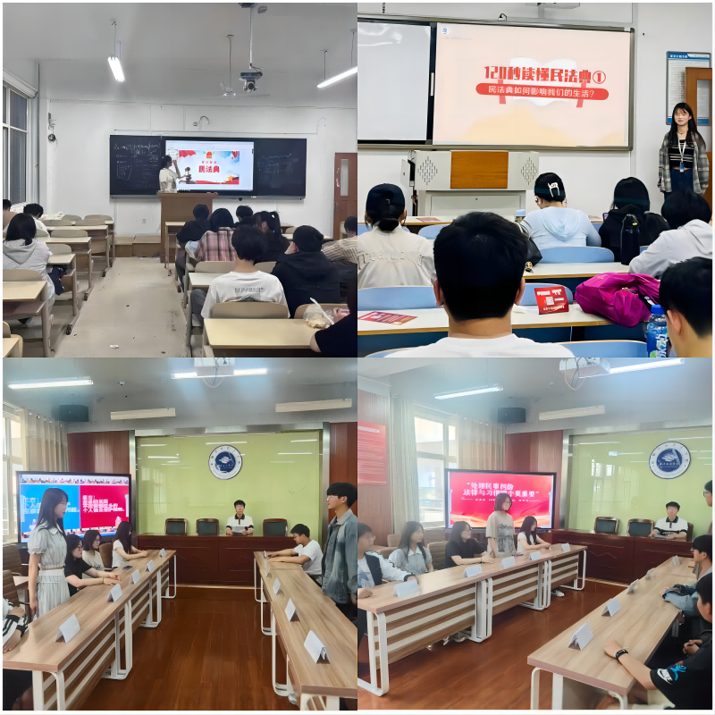 我系通过多种形式的主题活动进行“民法典”宣传。一是通过组织各班级召开“学习解读民法典”主题班会,通过对民法典的内容解读、日常案例分析等形式,让同学们深入了解民法典并与日常生活相联系;二是以视频的形式让同学们了解民法典如何影响我们的生活,通过生动有趣的动画视频让同学们对民法典有更加清晰的认知;三是举办民法典辩论赛,以“处理民事纠纷法律与习惯哪个更重要”为辩题,在双方同学的激烈辩论中,增强了同学们的法治观念和法律意识,又让同学们认识到习惯养成的重要性。