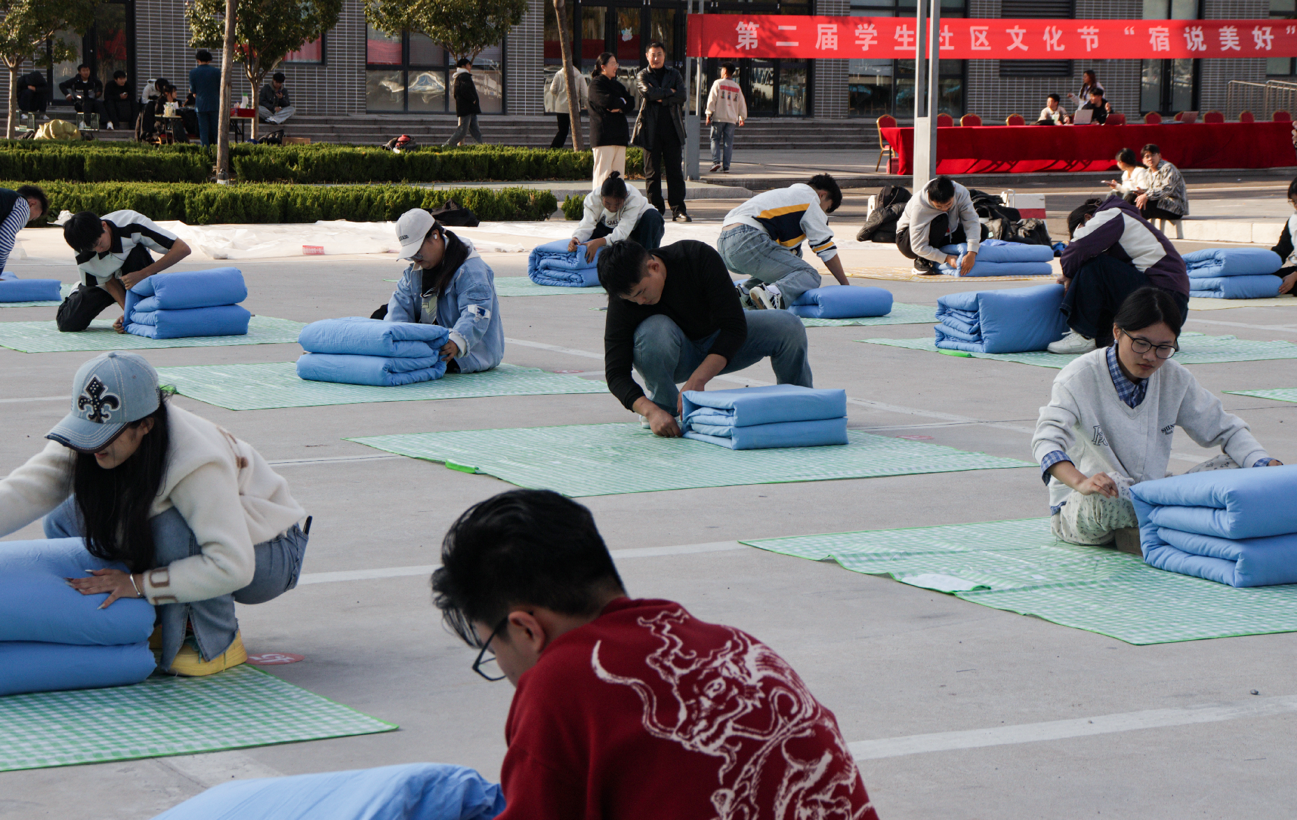 为丰富学生社区文化活动,营造整洁有序,积极向上的学生社区氛围,引导同学们养成良好的生活习惯,提升生活技能,增强自我管理意识,促进同学间的交流互动,打造和谐美好的社区生活。11月4日下午,我校第二届学生社区文化节“宿说美好”百人叠被大赛在“一站式”学生社区服务中心广场开赛。来自各系部的120名同学齐聚赛场,以被为“战场”,展开了一场兼具实用性与观赏性的技能比拼。