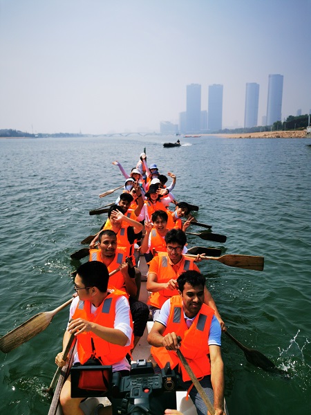 划龙舟是端午节一项重要的民俗活动,在传承中国传统文化的同时,还蕴含着团结、拼搏、进取的体育精神,已成为一项重要的竞技类体育运动。在奥林匹克水上运动公园,国际教育系组织同学们学习划龙舟、体验中国传统民俗活动。老师首先向大家介绍了赛龙舟的来历,让大家了解到赛龙舟的悠久历史,讲解了赛龙舟前举行的各种纪念仪式,让同学们明白中国人民对风调雨顺、平安丰收的美好愿望。随后,教练教大家划龙舟正确的坐姿、握浆姿势以及保持平衡的方式。最后,师生齐心协力、激浪挥浆,体验划龙舟、赛龙舟的乐趣。