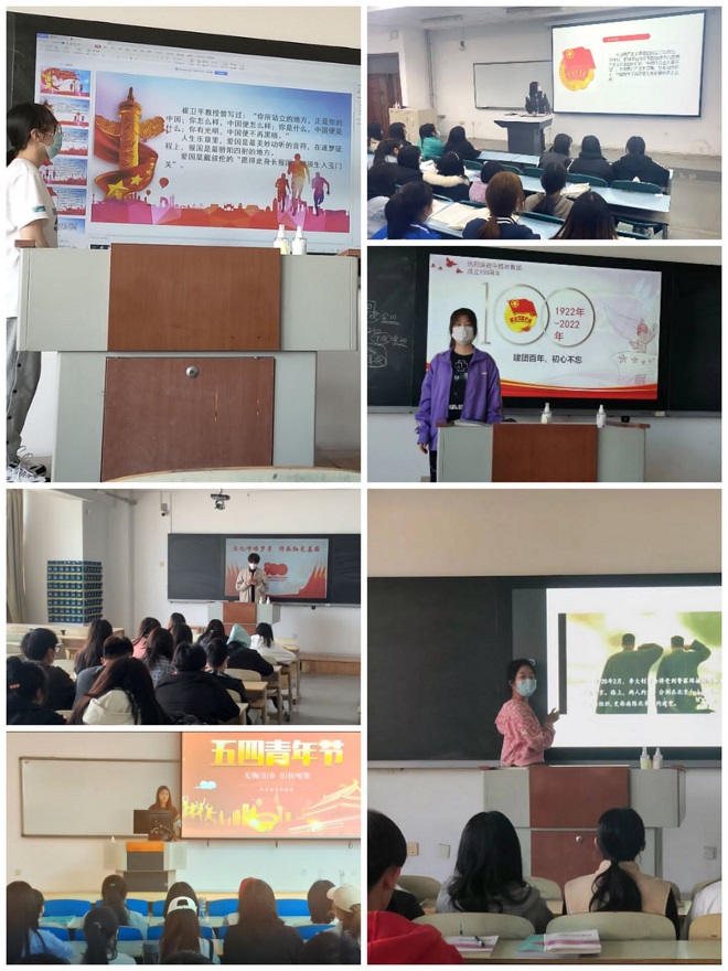 本月活动围绕“学习光辉团史,树牢理想信念”主题开展,由各班级以歌唱红歌、主题演讲、班报比赛等丰富多样的形式进行。在本月活动中,同学们歌唱了《光荣啊!中国共青团》、《五月的鲜花》等经典红歌,围绕“庆祝建团百年”、“团旗伴我成长”等主题在班内开展演讲比赛。为纪念五四运动,各班级组织开展了“身怀报国心,永远跟党走”演讲比赛及“五月的鲜花”板报设计比赛。同学们嘹亮激昂的歌声、富有感情的朗诵声、充满新意的画报,充分展现出新时代青年大学生爱国爱团热情和荣誉感、使命感、责任感。学生们纷纷表示,作为新时代青年大学生,要积极响应习近平总书记号召,继承发扬五四精神,不断开拓进取,勇担时代重托,做走在时代前列的奋进者、开拓者、奉献者。