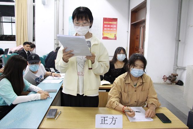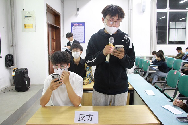 辩论赛以自由辩论的形式展开,参加比赛的共有8个小队,每队由4个辩手组成,主要聚焦当代大学生关注的热点话题“大学生兼职对大学生有利还是有弊”“高学历的人去当网红是不是浪费”“时势造就英雄还是英雄造就时势”“疫情对异地恋的情侣是不是‘雪上加霜’”四个辩题进行辩论。比赛过程激动人心,就“大学生兼职对大学生有利还是有弊”这一辩题的辩论比赛时,正方以大学生应利用课余时间去提升自己的专业技能,去做一些有助于自己发展的事情,而不是去盲目地靠体力劳动去赚取钱财,严谨有据的阐述“大学生兼职对大学生有弊”这一观点,反方则认为,大学生迟早是要步入社会的提前利用课余时间去获取以后社会工作的经验是很有必要的,据理力争论证“大学生兼职对大学生有利”这一观点。双方辩手始终围绕着辩论主题展开激烈辩论。整场比赛高潮迭起,精彩不断,观众也积极参与,和选手们互动。