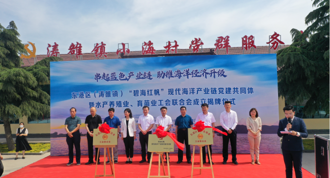 5月28日,日照市东港区(涛雒镇)“碧海红帆”现代海洋产业链党建共同体暨水产养殖业、育苗业工会联合会揭牌仪式在涛雒镇小海村举行,海洋技术系受邀参加。