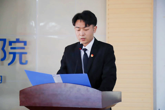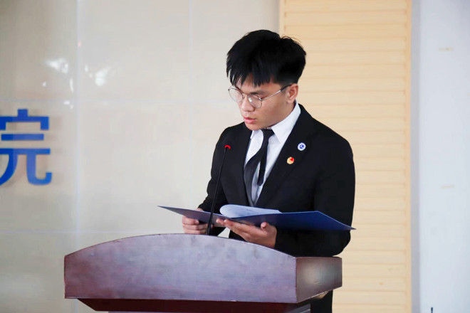 入团仪式在庄严肃穆的国歌声中拉开序幕。辅导员吕婷婷宣读了2022年上半年新发展团员名单。张西进为新团员佩戴团徽、发放团员证。在老团员代表纪伯洋带领下,11名新团员面向团旗整齐列队,举起右拳庄严宣誓:“我志愿加入中国共产主义青年团……”。誓言铿锵有力、激情豪迈。新团员代表丁茂鑫发言,汇报了自己对共青团的认识和参加团课培训的感受,表达了加入团组织的激动心情和履行团员义务、勇担民族复兴重任的决心。老团员代表张大耸发言,回顾了自己入团以来积极参加学习实践、主动服务同学的收获感悟,希望与新团员们携手并肩、共同进步。