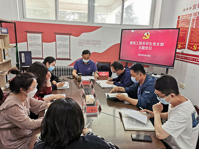 5月19日下午,建筑工程系学生党支部在海润楼M101开展五月份第一次主题党日活动,党支部书记乔梓主持,全体党员教师参加活动。