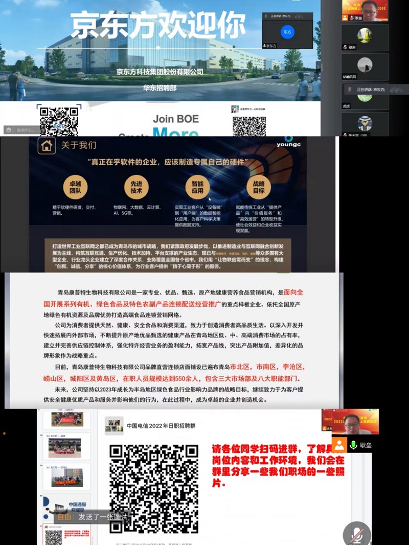 参与“直播带岗”活动的企业为青岛永创信息技术、BOE京东方、山东信息产业服务公司和青岛康普特生物科技,所提供岗位总数超过150个,涵盖电子信息、通信、物联网、软件、食品、销售等多种职位。新冠疫情的常态化防控,对经济发展活力与企业人才需求增长产生了较大的不利影响。电子信息工程系积极探索,对接校企合作企业北京华晟经世信息技术股份有限公司,整合校企双方优势资源,发挥校、企、师、生等各方积极性,多措并举,为最大限度促进电子信息工程系2022届毕业生能就业、就好业提供保障。