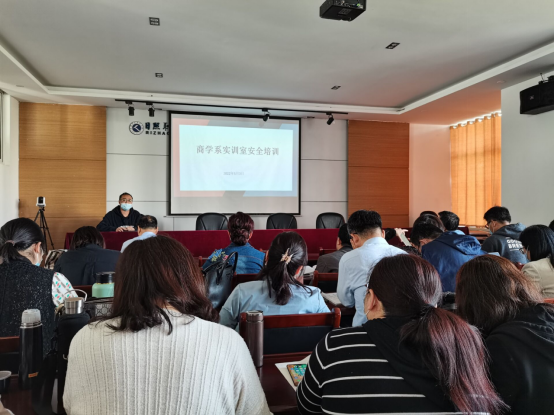 为深入构建平安校园,进一步加强实训场所安全管理,提升实训室安全管理水平,商学系于5月3日下午组织全体老师举办了实训室安全管理培训会,实训室管理员申加强首先带领大家学习了《高等学校实验室安全检查项目表(2022年)》,并对文件中涉及到的考核标准进行了解读。然后向全体老师传达了商学系根据省教育厅安全检查项目表制定的下一步实训室开展安全实训的具体安排和要求。