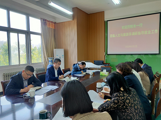 5月3日下午,党委委员、副院长厉建刚、招生就业处负责人厉建欣、副处长杨同华一行到人文与旅游系调研指导2022届毕业生就业工作。人文与旅游系党总支书记李侠、总支班子成员、教研室主任、就业联络员和毕业班班主任代表参加了此次调研活动。